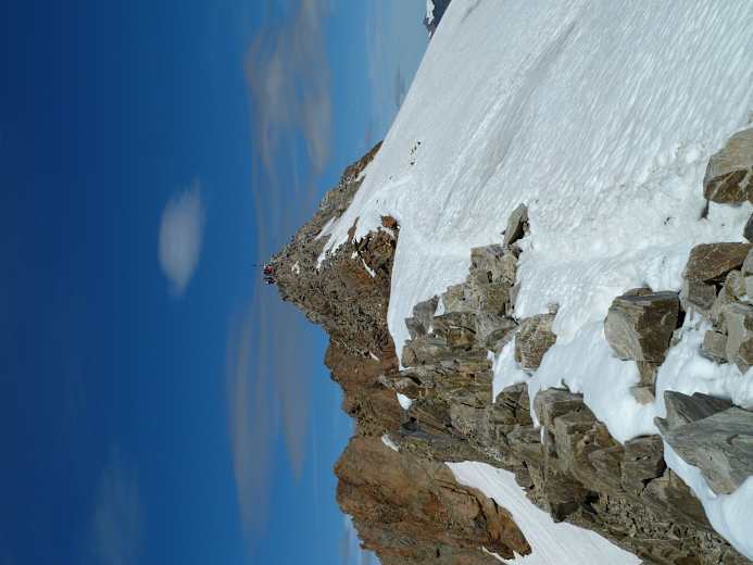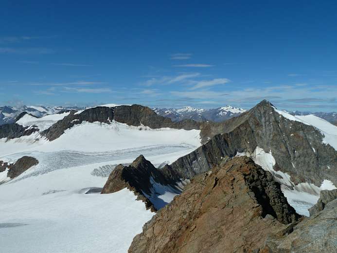 Über einen markanten Weg am Nordgrat hinunter in die Becherscharte (3.156 m), nun entweder am Gletscherrand oder weglos über den scharfen Blockgrat ein Stück ansteigend, dann auf guter, teilweise seilgesicherter Steiganlage (Karl-Vogel-Weg) über den Blockgrat steil ansteigend und unschwierig zum Signalgipfel (3.393 m). In problemloser Kletterei über den Blockgrat geht es zuerst eben und dann über einen kurzen steilen Anstieg zum Gipfelkreuz auf dem Wilden Freiger (3.418 m).