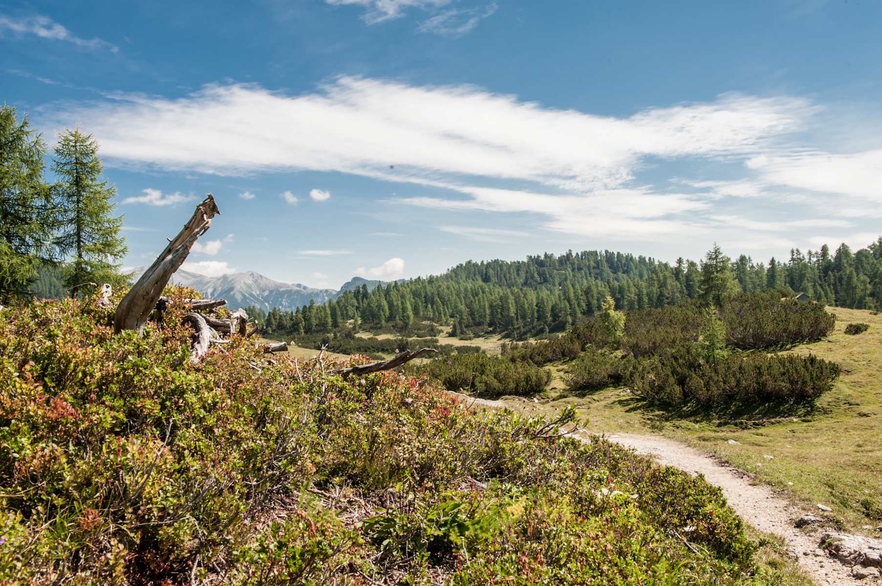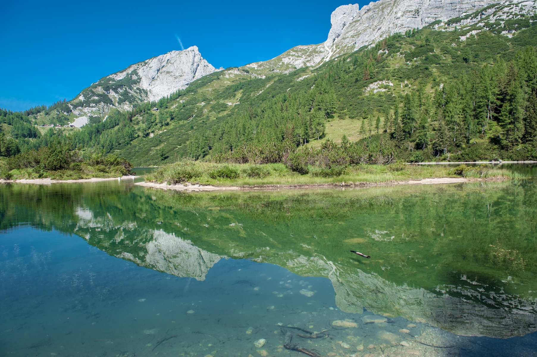 Nicht unweit davon liegt nach einem weiteren Anstieg die Leistalm, welche bereits zur ersten Einkehr lädt. Leckere Schmankerl warten auf hungrige Wanderer. Danach geht es gestärkt zu den verlassenen Resten der Interhütten und durch das Schlangental bergab zum Grimmingbach. Die Gumpen laden zur Abkühlung ein bevor es über die Brücke leicht bergauf durch dichten, Schatten spendenen Wald, weitergeht.