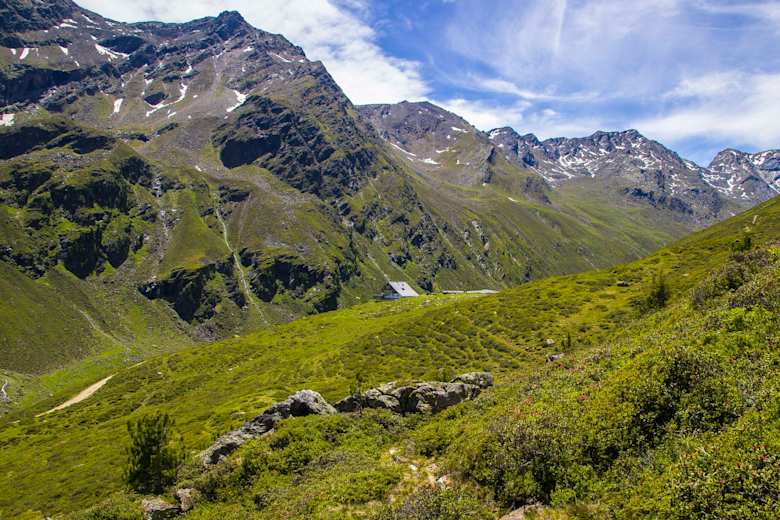 Mit steigendem Gelände wird der Steig zunehmend alpiner, und nach mehreren Serpentinen und Wiesenabschnitten erreicht man schließlich die Potsdamer Hüttee auf etwa 2.009 m Höhe. Die Hütte bietet einen traumhaften Ausblick auf das Fotschertal und die umliegende Bergwelt.