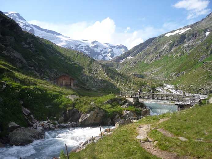 Östlich der Maureralm wandert man durch felsiges Gelände stetig empor und überquert bei einer Brücke den Maurerbach, bis man schließlich die Essener-Rostocker-Hütte (2.207 m) erreicht.