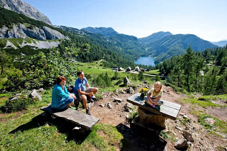 Nun geht es weiter zum Aussichtspunkt „Steirersee-Bankerl". Von hier aus hat man einen grandiosen Ausblick zum Sturzhahn (2.031 m) sowie auf den wundervoll grün schimmernden Steirersee.