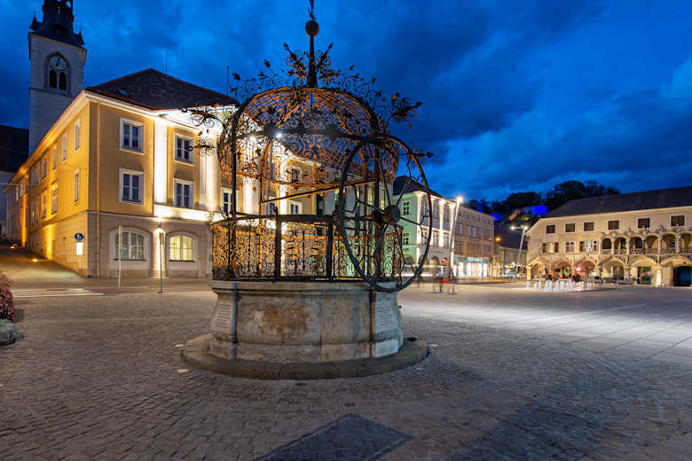 Sie halten sich beim Kornmesserhaus rechts in Richtung Rathaus, gehen an diesem rechts (kleine Gasse, Hoher Markt) bergauf vorbei bis zur Pfarrkirche. Hier biegen Sie erneut rechts in Richtung Schlossberg und halten sich nun links entlang der Parkgasse und der Kreckerstraße in nördlicher Richtung bis zur bezeichneten Abzweigung beim Haus Kreckerstraße 12 (gelbes Hinweisschild) auf den Madereckweg.