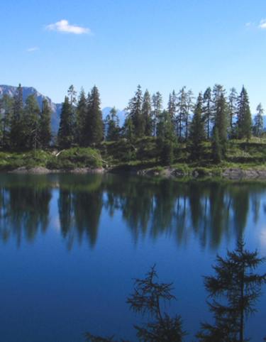 Nach zahlreichen Kehren in meist recht dichtem Wald öffnet sich nach etwa 2 1/2 Stunden Gehzeit von Neuberg aus gerechnet die weite Almfläche mit prächtigen Blicken auf die umgebende Gebirgslandschaft.