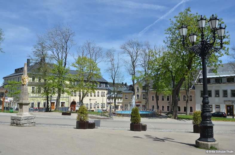 Vorsichtig gehen wir über die Straße und gegenüber in den Fußweg. Am Ende des Fußwegs folgen wir immer geradeaus der Straße. Wir kommen am Markt vorbei in die Annaberger Straße und biegen links in die Bahnhofstraße ein. Dieser folgen wir zurück zum Bahnhof im Kurort Oberwiesenthal. Autofahrer biegen nicht links ein, sondern gehen weiter bis zur T-Kreuzung, dort kurz rechts und dann links zum Zentralparkplatz.