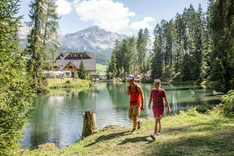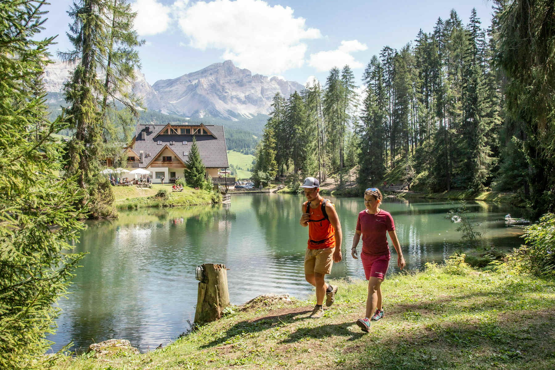 Leichte Halbtageswanderung rund um Badia in Südtirol auf dem Tru di lec/Seeweg: Dabei geht es mit wunderbarem Ausblick auf die umliegende Dolomitenlandschaft durch die saftige Natur des Tales zu zwei idyllischen Seen: dem höhergelegenen Lech dlá Lunch sowie dem dunkelgrünfarbigen Lech da Sompunt.