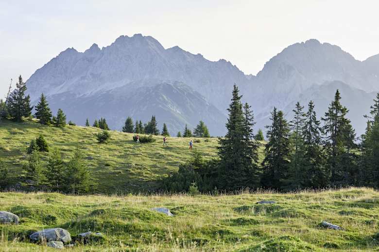 Man wandert von der Grünbergalm hinauf auf die Aussichtsplattform. Diese eröffnet Richtung Horn einen weiten Blick auf die Mieminger Kette, die Stubaier Alpen und das Mieminger-Plateau.
