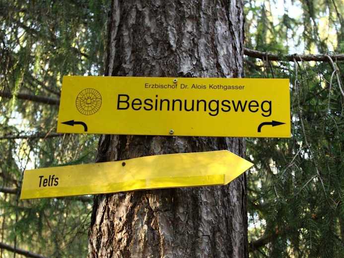 Mittelschwere Wanderung in der Region Innsbruck in Tirol: Auf dieser Tour kann man sich auf das Wesentliche besinnen. Der so genannte „Besinnungsweg" führt von Maria Locherboden zur Heilig-Geist-Kirche in Telfs. Junge Künstlerinnen und Künstler verknüpfen am Weg an 12 Stationen Botschaften der Bibel mit den Gegebenheiten der Natur und den Möglichkeiten der Kunst.