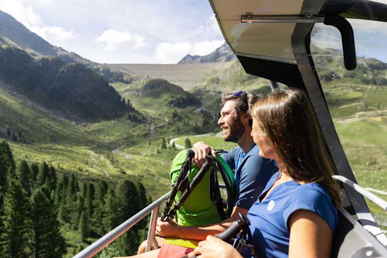 Mit der Drei-Seen-Bahn fährt man zur Bergstation. Man wandert über die Drei-Seen-Hütte zum Finstertaler Stausee bis ans südliche Ende.