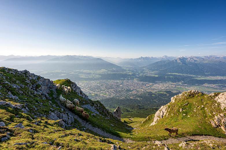 Von der Bergstation Hafelekar (Auffahrt mit den Innsbrucker Nordkettenbahnen) sollte man gleich zu Beginn den breiten Weg zur Hafelekarspitze einschlagen, um das gewaltige Panorama in vollen Zügen zu genießen. Danach wandert man entlang des Goetheweges, der imposant in den Felsen gehauen und zum Teil seilversichert ist, nach Osten. Dabei hat man durchwegs gewaltige Tiefblicke auf Innsbruck und weit über die Tuxer- und Stubaier Alpen.