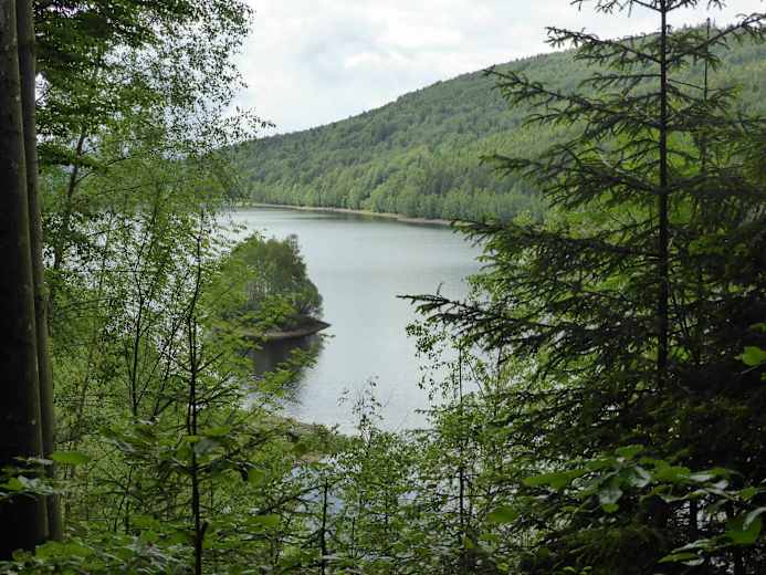 An der Dammkrone verlässt man die Markierung „Borstgras“ und geht nach rechts zum nördlichen Ufer. Hier folgt man der Markierung „Gläserner Steig“ nach links und später an der Kreuzung nach rechts hinunter bis Buchenau.