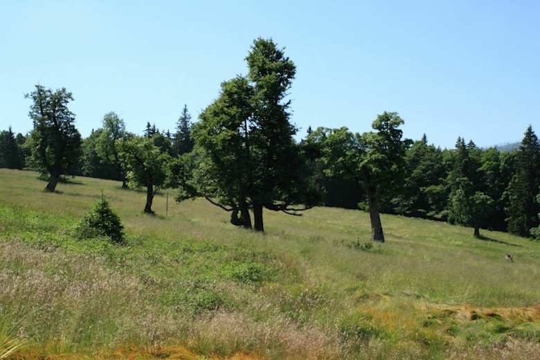 Ab hier orientiert man sich an der neuen Markierung „Borstgras“ in Richtung Almschachten. Bohlenstege führen durch die Moorwiesen und Feuchtbereiche. Am Verlorenen Schachten geht der Weg bergab bis zu einer scharfen Rechtskurve und mündet auf einer Schotterstraße, die vorbei am Blockhaus Schachten bis zur Trinkwassertalsperre Frauenau führt.