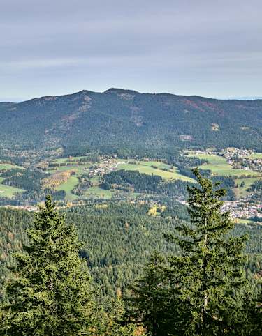 Die Aussicht über das Waldmeer des Nationalparks Bayerischer Wald lässt sich vom Gipfel des Großen Falkenstein besonders genießen. Der Weg führt durch das Höllenbachspreng mit seinen beeindruckenden Felsformationen hinauf bis zum Gipfel auf 1.315 m.