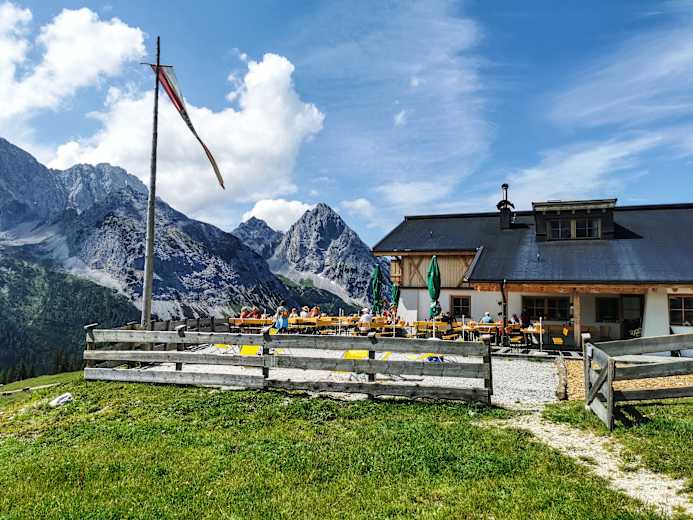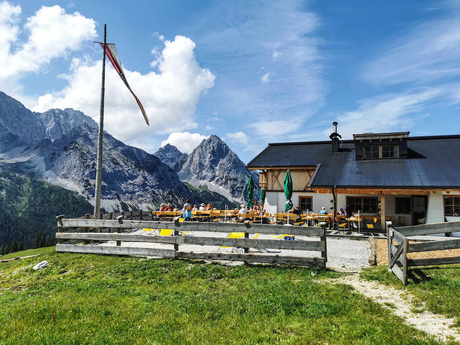 Von Leutasch oder Ehrwald marschiert man auf dieser lohnenden Wanderung auf die Hochfeldern Alm im Gaistal (1.750 m) im Wettersteingebirge in Tirol.
