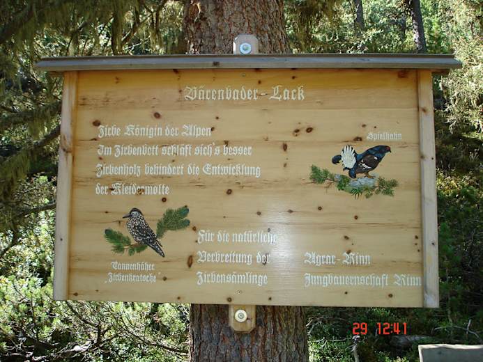 Ausgehend vom Zirbenweg unterhalb der Roten Wand wandert man zur Bärenbader Lacke, über die Kriegerkapelle und dem Vogelforcher Bödele bis zur Rinner Alm und weiter nach Rinn.