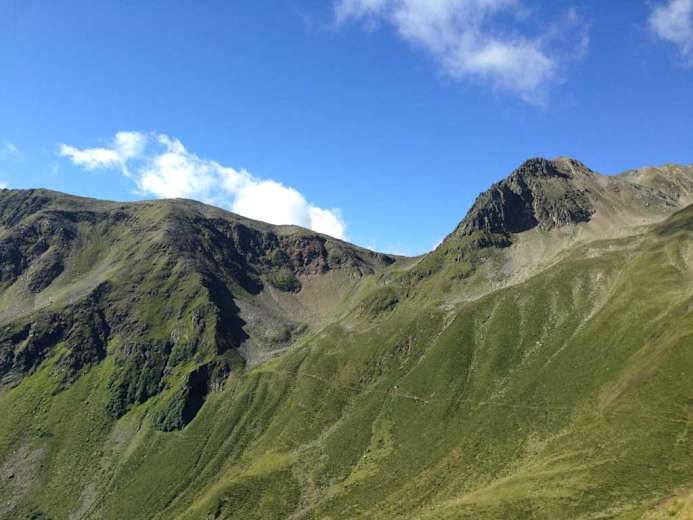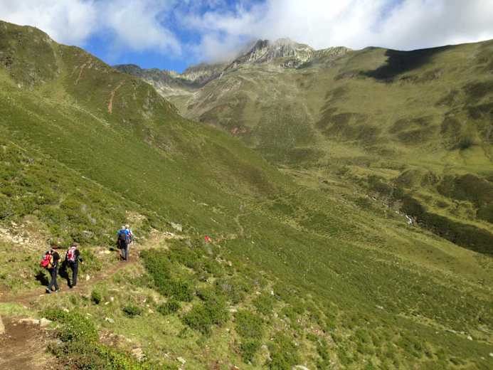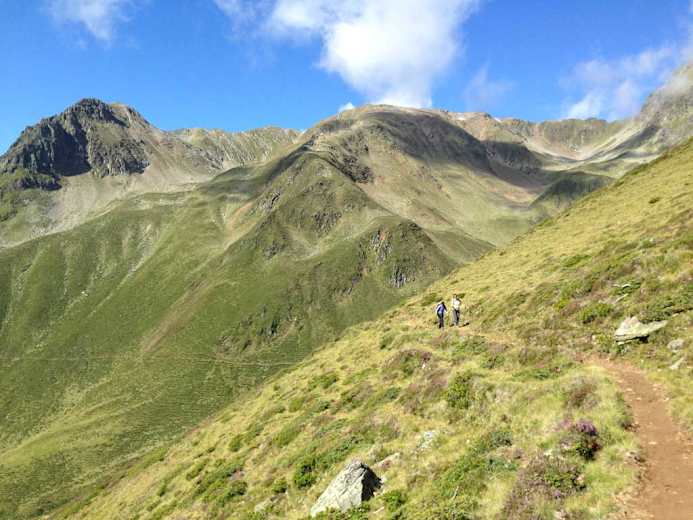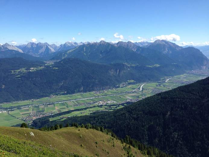 Man wandert über einen schmalen Steig zur Flaurlinger Scharte auf 2.400 m. Auf der Inntalseite geht es bis zur Oberhofer Melkalm auf knapp 1.700 m. Von hier folgt der Abstieg in den Ort Oberhofen.