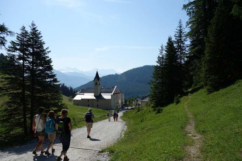Auffahrt mit dem Auto zum Kloster auf 1.641 m (mautpflichtig). Der thematische Rundwanderweg beginnt beim Kloster Maria Waldrast und führt entlang des Quellenweges durch das Almgebiet zur Matreier Ochsenalm. Von dort in einem Bogen etwas aufwärts am Fuße der Serles und vorbei an den Kraft- und Besinnungsplätzen mit Skulpturen und Relikten zurück zum Kloster Maria Waldrast.
