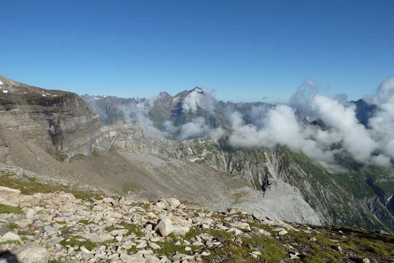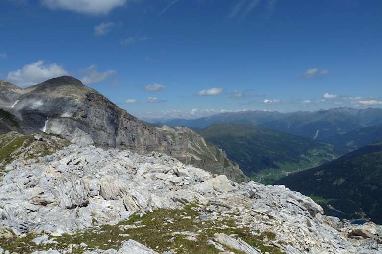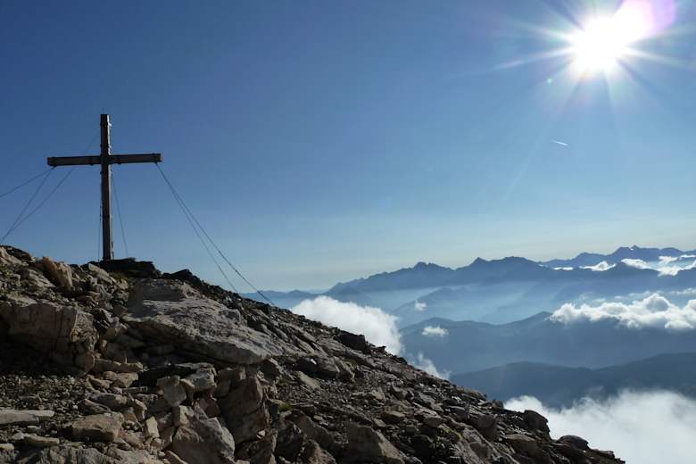 Oben angekommenen bietet sich ein interessanter Anblick: ein Plateau mit Steinplatten und Felsen, durchzogen von grünen Grasflächen. Das letzte Stück bis zum Gipfelkreuz ist angenehm und ist ohne Schwierigkeiten zu erreichen. Vom Gipfel hat man einen atemberaubenden Weitblick: Habicht, Serles und die Nordkette im Norden, Olperer, Fußstein, Schrammacher und das sanfte Obernbergtal im Osten sowie die zahllosen Gipfel der Dolomiten im Süden. Ein Blick nach unten lässt den zweigeteilten türkisblauen Obernberger See erkennen.
