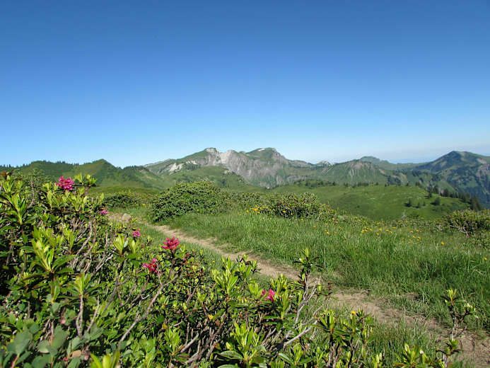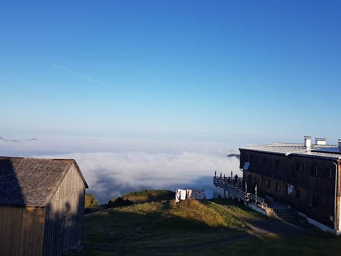 Der Weg ist nicht zu steil und wir können uns auf den weiteren Wegverlauf einstimmen. Ein weiteres Mal blicken wir gegen Osten in den Bregenzerwald, bevor wir zuerst das Jägerstüble erreichen und später die Portlaalpe (1.726 m). Auf dem etwas höher gelegenen Jöchle (1.813 m) stehen wir Minuten später.