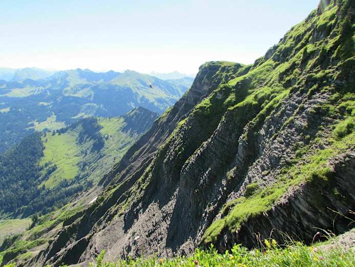 Nun wandern wir entlang des Dornbirner First. Es ist eine Kette von mittelhohen Gipfeln, die entlang des Weges auf uns warten. Der Höhenweg verläuft meist etwas darunter, so dass wir bei Lust und Laune den einen oder anderen besteigen können: den Alpkopf (1.788 m), die Mörzelspitze (1.830 m) und der Leuenkopf (1.830 m). Bevor wir nach einem längeren Marsch vom First gegen Norden absteigen, können wir auch noch der Guntenspitze (1.811 m) einen Besuch abstatten.