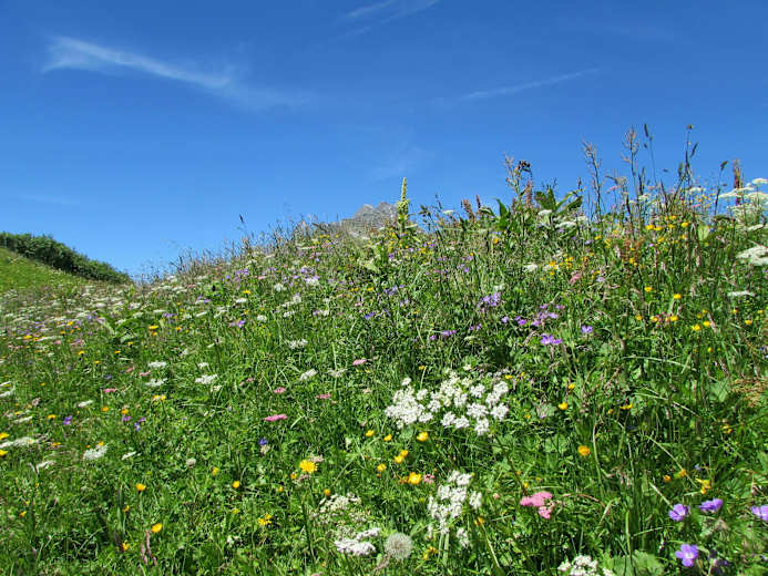 Wir wandern jedoch nicht ganz bis zur Straße, sondern biegen gute einhundert Meter früher über den Valfagehr Bach und dann gegen einen kleinen Hang zum Rauzmähder. Der Weg durch die Almwiesen könnte romantischer nicht sein: ein hüfthohes Blumenmeer zwischen Felsblöcken und kleinen Holzschuppen.