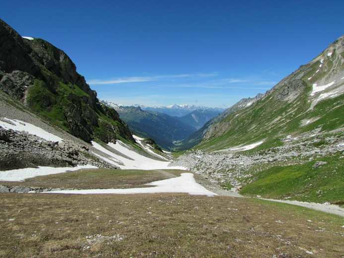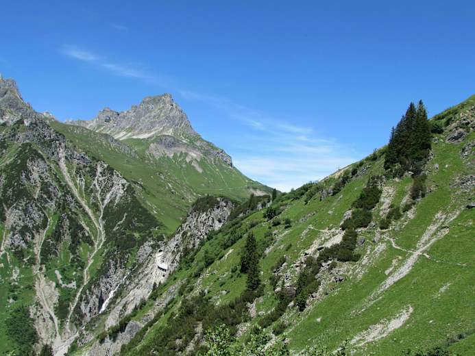 Der Ausblick von der Hütte geht vor allem nach Süden - zum Verwall. Der Norden und Osten ist durch die mächtige Wand der Valluga abgeschirmt. Wenn wir nach Westen blicken, so folgen wir dem Klostertal. Wir sehen aber auch schon einen Teil unseres heutigen Weges, der sich nicht zu steil und nicht zu flach der Alpe Rauz (1.602 m) zuwendet.