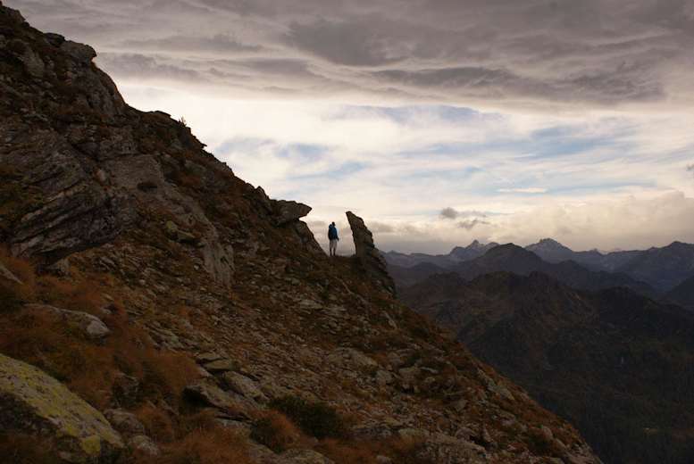 Ein Abstecher (nicht mehr als 15 Minuten) auf das Hochfeld (2.189 m) mit seinem schönen Gipfelkreuz lohnt sich jedenfalls. Vom Gipfel wandert man auf dem grasbewachsenen Bergrücken dem Schiedeck zu. Ab hier wird der Weg eindeutig alpin. Gras und Latschen – die bisher den Weg säumten – weichen zur Seite und machen Platz für schroffe Felsen sowie größere und kleinere Steinbrocken entlang des Weges.