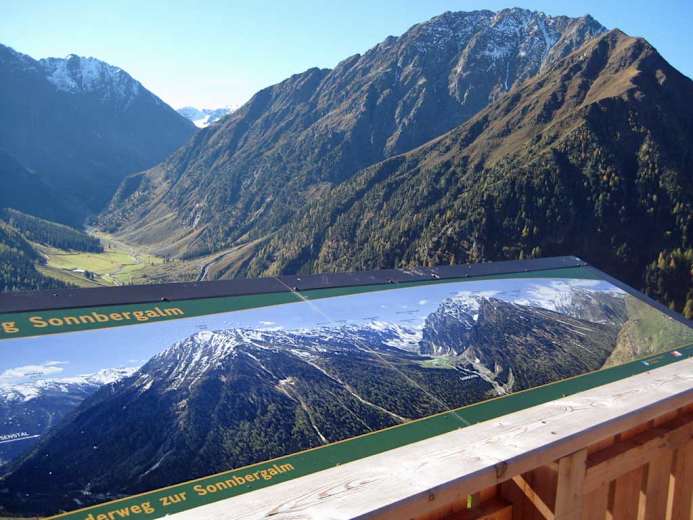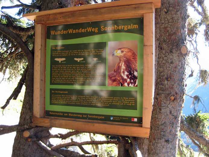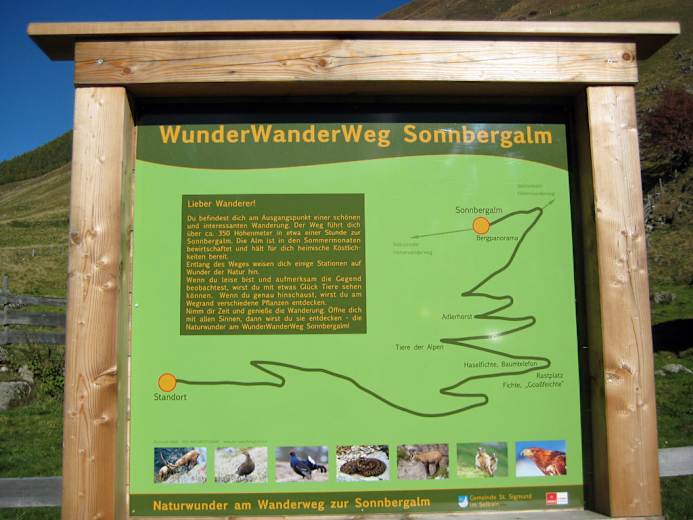 Startpunkt dieser Wanderung ist der gebührenfreie und gut beschilderten Parkplatz wenige 100 m nach St. Sigmund im Sellrain - von Innsbruck kommend. Die interessante Wanderung führt in etwa einer Stunde und über 350 Hm zur bewirtschafteten und am Sellrainer Höhenweg gelegenen Sonnbergalm. Einige illustrierte Stationen entlang des Weges weisen auf Wunder der Natur hin.