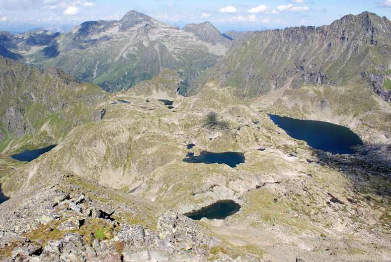 Vom Gipfel führt der Weg nun recht steil, über einen schotterigen Steig bergab in den Klafferkessel. Beim Abstieg ist durch das lose Gestein große Vorsicht geboten. Die hochalpine Seenplatte ist dennoch rasch erreicht und begeistert mit faszinierender Vegetation – allen voran den leuchtend grünen Moosen an den Ufern der Seen.
