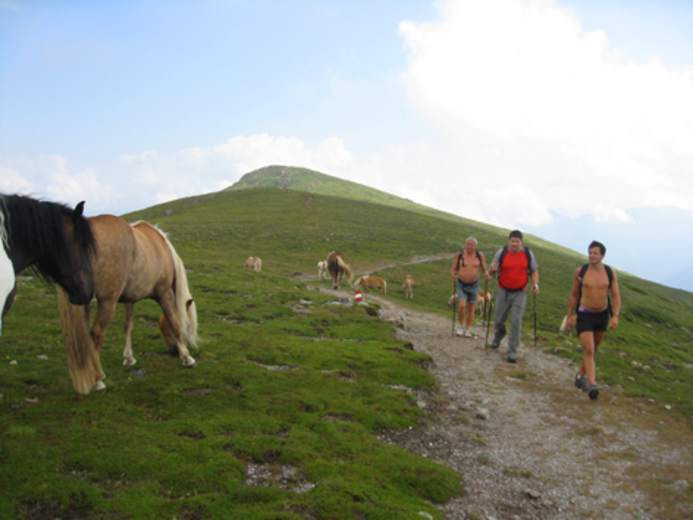 Mit der Gondel der Bergeralmbahn lässt man sich gemütlich auf über 1.500 hm bringen. Von dort wandert man weiter auf dem markierten Steig Nr. 41 in etwa 1,5 Stunden bis zum Gipfel mit fantastischem Rundblick. Hat man den Anstieg geschafft und ist am Kreuz angekommen, geht es über einen nicht markierten aber gut sichtbaren Steig am Grat fast eben zum zweiten Kreuz am Eggerberg. Vom Eggerberg führt nun der markierte Weg Nr. 45 vorbei am dritten Gipfel „s’Kreuzl“ und nach einer Weggabelung folgt man dann Weg Nr. 44 zur Vallmaritzalm. Der Abstieg erfolgt dann über den Wirtschaftsweg (Nr. 40) zurück zur Mittelstation der Bergeralm und mit der Gondel ins Tal.