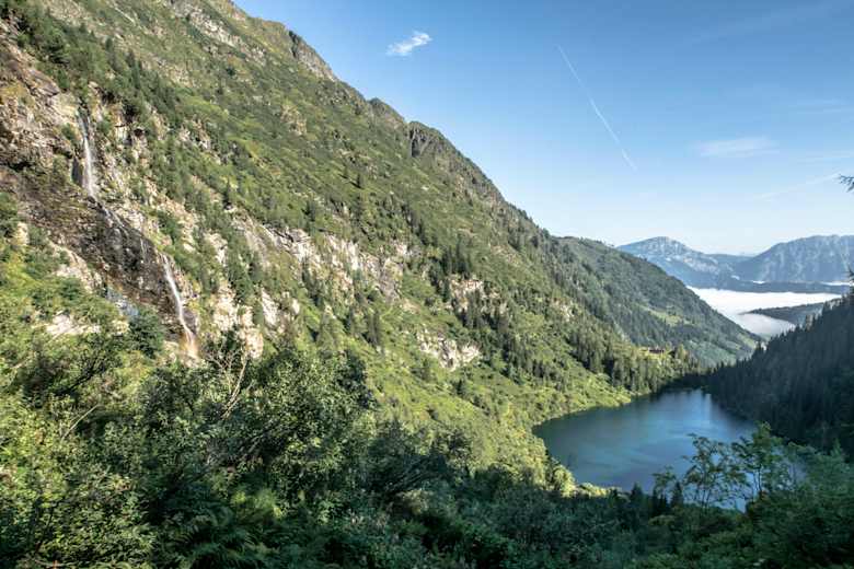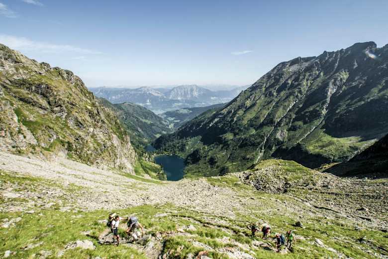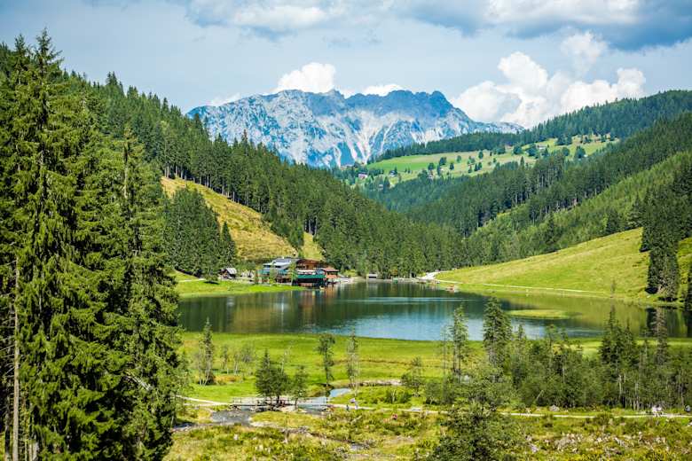 Von der Preintalerhütte geht es vorbei an der Kulisse der Hochwildstelle (2 747 m) über den Höfertsteig in Richtung Neualm. Am Wegkreuz Höfertsteig folgst Du noch vor der Neualm rechts bergauf dem Weg Nr. 782 zur Neualmscharte (2 347 m). Während des Aufstieges genießt Du den Blick auf den tief unten liegenden Riesachsee, von der Scharte den atemberaubenden Blick hinunter ins Seewigtal. Nach einer kurzen Rast beginnst Du nun den recht steilen Abstieg. Als erstes erreichst Du den Obersee, dessen Ufer sich wunderbar für eine erneute Rast eignet. Etwa 40 Minuten später erreichst Du dann die Hans-Wödl-Hütte oberhalb des Hüttensee, wo Du Dir eine ausgiebige Rast redlich verdient hast. Danach geht es noch eine gute Stunde bergab zum Steirischen Bodensee und zum Parkplatz Seewigtal, von wo Dich die Wanderbuslinie 976 zurück nach Schladming bringt.