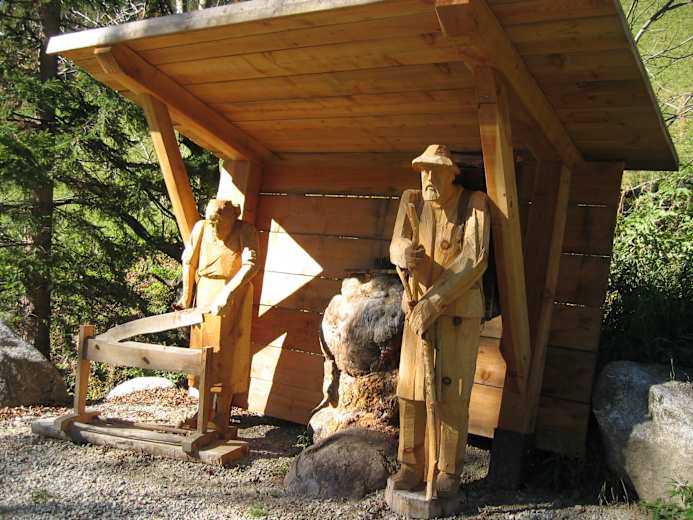 Vom Skulpturengarten führt der Rückweg über die Straße zum Gasthof Garber (Bushaltestelle) und zurück zum Parkplatz. Ein Direktabstieg zum Bühel ist ebenso möglich.