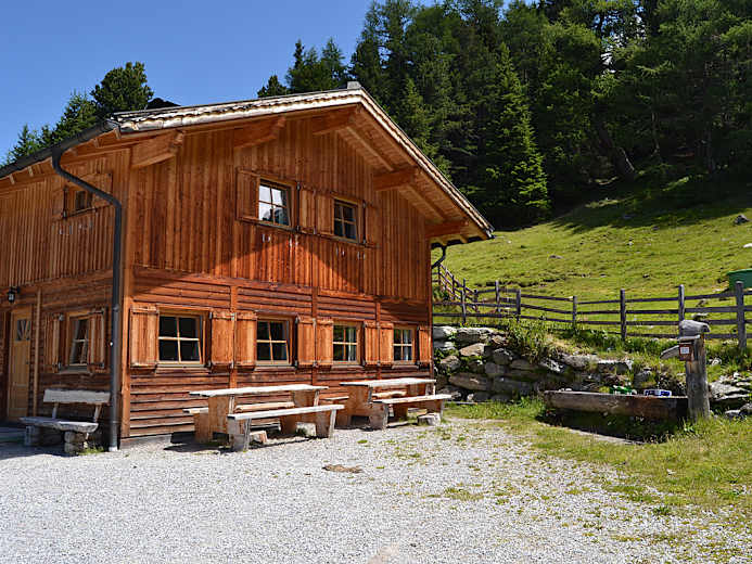 Auf den urigen Holzbänken vor der bewirteten Profeglalm läßt es sich bestens nach dem Ausstieg ausrasten, nachdem man sich beim Brunnen mit klasklarem Gebirgswasser erfrischt hat. Die Hütte ist von Juni bis September an den Wochenenden geöffnet.
