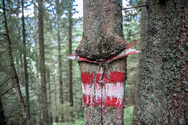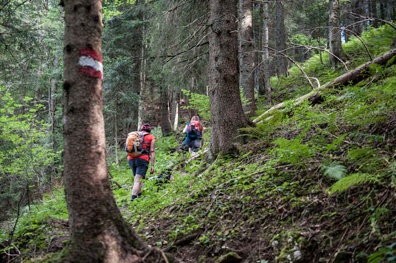 Vorerst steil durch den dichten Wald bergauf gelangt man bald auf einen Forstweg der zu den Sinirböden führt, zwischen Nojer (1.492 m) und Hochschweiz (1.306 m). Durch die Wildfütterungen durch und alsbald wieder von der Forststraße in den Wanderweg. Bei der nächsten Kreuzung mit dem Forstweg diesem kurz bergab folgend und geradewegs den steilen Steig bergab weiter - nicht rechts auf den Weg Nr. 209 abzweigen.