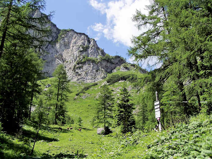 Ein wunderschöner Blick auf die nahe Frauenmauer öffnet sich – das erste Ziel ist also nicht mehr weit. Etwas oberhalb der Neuwaldalm zweigt der Steig zum Höhleneingang ab (Hinweistafel), die Höhle ist von der Neuwaldalm noch rund 45 Gehminuten entfernt.