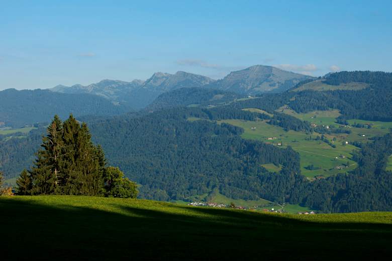 Bei der folgenden Weggabelung am Waldrand zweigt rechts ein kurzer Abstecher zur Torfhütte ab. Dort sind Geräte ausgestellt, die zum Torfabbau verwendet wurden, und eine Tafel erzählt Wissenswertes über das Torfstechen. Der Weiterweg Richtung „Hochsträß, Oberreute, Weiler“ steigt nach links kurz an und bringt uns auf freie Wiesen hinaus, wo sich ein herrlicher Blick auf die Bergkämme des Bregenzer Waldes und auf die Nagelfluhkette mit dem Hochgrat öffnet. Geradeaus über die Wiese bietet das Hochsträßstüble eine sonnige und aussichtsreiche Einkehrmöglichkeit.