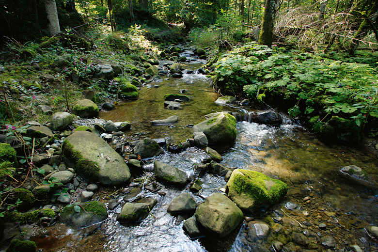 An ihm entlang wandern wir nach Süden, folgen wiederum ein kurzes Stück der Straße und zweigen nach 50 Metern links über einen Holzsteg auf einen Fußweg ab. Er kreuzt gleich darauf bei den Häusern von Vorderschweinhöf eine weitere Straße und führt an einem malerischen Bächlein entlang, das sich seinen Weg bald durch einen von waldigen Hängen eingefassten Graben sucht.