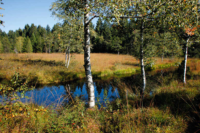Für eine kürzere Runde könnte man hier links Richtung „Hochsträß, Kalter Brunnen, Oberreute“ abbiegen und in einer knappen Stunde nach Oberreute zurückkehren. Zum Wildrosenmoos halten wir uns rechts und sind nun auf dem „Grenzerpfad“ unterwegs. Bei einem Holzstadel geht es links zu Holzdielen, die über den moosigen Boden zum Moorweiher leiten. Ein paar Bänke laden dazu ein, diesen Ort in aller Ruhe zu genießen. Im fast schwarzen Gewässer spiegelt sich die typische Hochmoorvegetation mit Riedgräsern, Birken und Spirken (einer besonderen Art der Latschenkiefer).