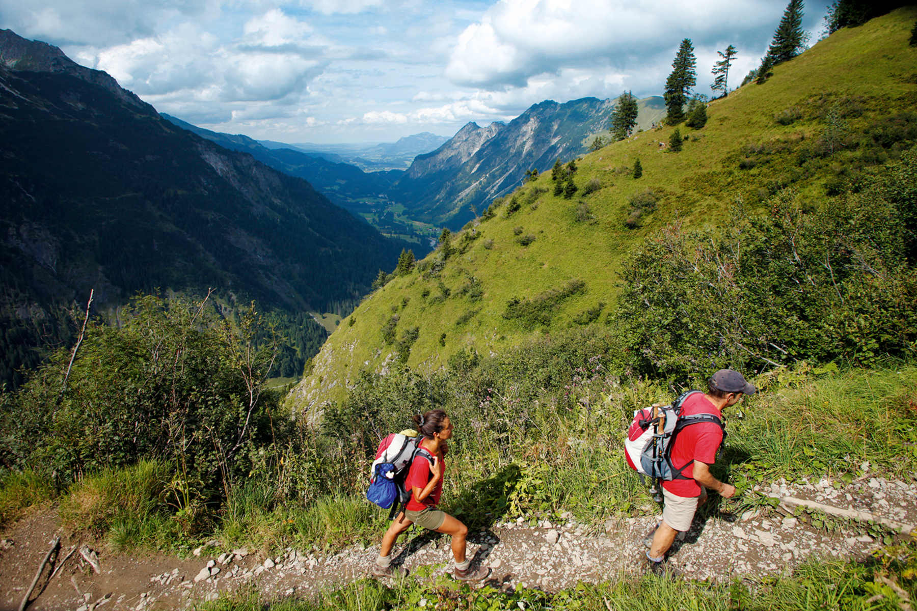 Dort fällt es schwer, sich nicht von den verführerischen Gerüchen aus der Küche zu einer Einkehr verleiten zu lassen. Über dem Wirtshaus ragen prominente Felsgipfel des Allgäuer Hauptkamms in den Himmel: Trettachspitze, Mädelegabel und Hochfrottspitze. Wir gehen über die Terrasse des Gasthauses, lassen den Anstieg zum Waltenberger Haus links liegen und folgen dem Steig zum Bacherlochbach hinunter.