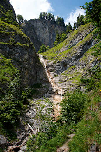 Über eine etwas ausgesetzte Wegpassage halten wir auf die Krähenwand im Talschluss zu. Unter den senkrechten Abbrüchen mit ihren Wasserfällen überqueren wir wiederum den Bach und überwinden mit Hilfe von Trittstufen und Seil eine Felsstelle. Ein schmaler Pfad windet sich, stellenweise ebenfalls mit Drahtseilen gesichert, in zahlreichen kleinen Kehren über die steilen Schluchthänge aufwärts, zieht anschließend über einen Rücken hinauf und biegt um einen Geländevorsprung mit schöner Aussicht auf Bad Hindelang und das Hintersteiner Tal, das vom Felsdreieck des Hochvogel und dem Daumenmassiv überragt wird.