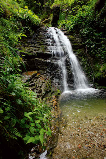Urwüchsige Schluchten in den Allgäuer Alpen und ein Bach im freien Fall: Unmittelbar über dem beliebten Ferienort Bad Hindelang wachsen von Felsen durchsetzte Steilhänge in den Himmel. Dort bearbeitet das Wasser des Hirschbachs seit Jahrtausenden unermüdlich das Gestein, doch der widerstandsfähige Hauptdolomit widersetzt sich hartnäckig dem unablässigen Anströmen. So ist ein steil abfallender Tobel entstanden, in dem der Bach auf seinem Weg ins Tal allerlei felsige Hindernisse überwinden muss.