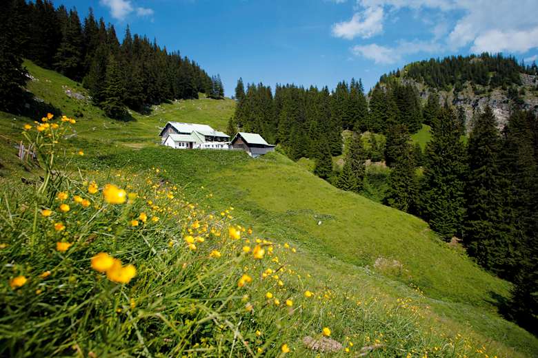 Kurz darauf treffen wir auf einen Forstweg. Wer die Runde abkürzen möchte, folgt ihm nach rechts Richtung „Oberjoch über Ifenblick“ und spart sich so gut 1:30 Std. bis Oberjoch. Wir nehmen links den Steig, der mit „Hirschalpe, Hirschberg“ ausgeschildert ist, und halten uns kurz darauf rechts. Der Anstieg verläuft über einen Wiesenrücken bergauf und mündet in einen Alpweg, der uns um den Kreuzbichl herum zur Hirschalpe bringt. Dort können wir Brotzeit machen und den Blick in den Talkessel von Bad Hindelang und bis ins Kleinwalsertal mit dem Hohen Ifen genießen.