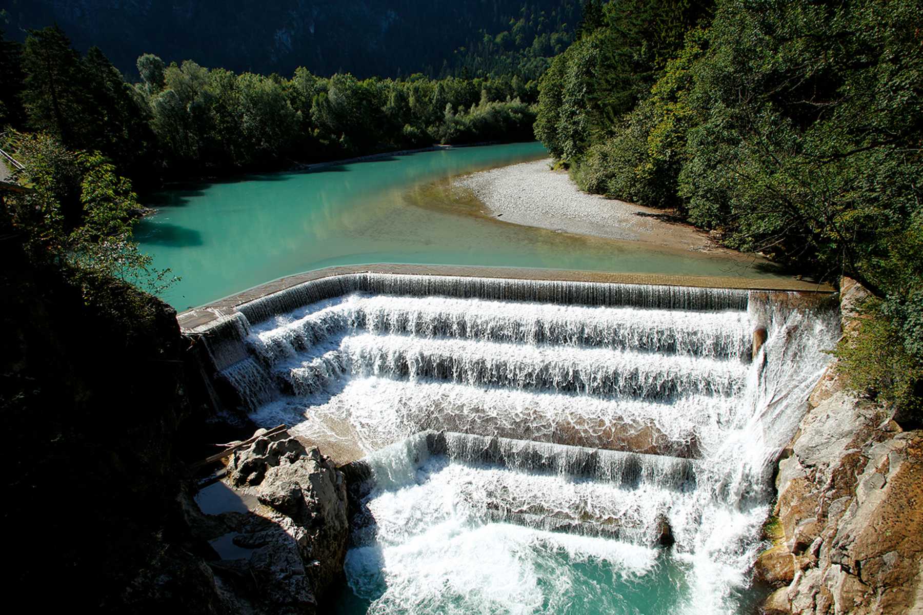 Die Stufen des Lechfalls wurden bereits 1784 angelegt, als man einen Stollen in den Fels sprengte, um Wasser für den Betrieb von Mühlen abzuleiten. Gischtend und brodelnd stürzen sich dort die Wassermassen in die Tiefe, bevor sie sich durch einen engen Felsschlund zwängen. Damit Seine Majestät das Naturschauspiel stilvoll genießen konnte, richtete man oberhalb der Schlucht eine Teestube ein. Auch der Volksmund weiß zu diesem Ort etwas zu erzählen. Im Fels soll der heilige Magnus seinen Fußabdruck hinterlassen haben, als er mit einem kühnen Sprung über die Klamm vor heidnischen Verfolgern floh.