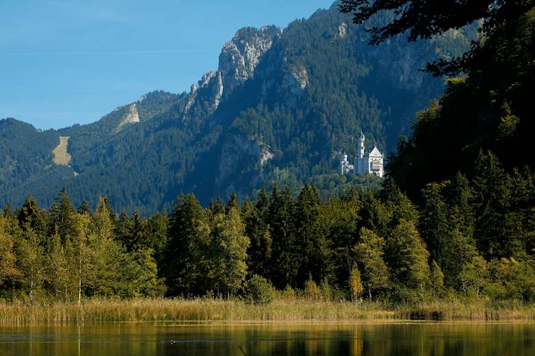 Am südlichen Ende des Schwansees beginnt rechts der Fischersteig, der sich in einigen Serpentinen den Waldhang hinaufwindet. Haben wir die Geländestufe überwunden, wandern wir, immer auf dem Hauptweg bleibend, flach zur asphaltierten Fürstenstraße. Sie bringt uns links hinunter zum belebten Ostufer des Alpsees mit dem Museum der bayerischen Könige und dem Restaurant Alpenrose. Dort spazieren wir auf dem Uferweg am See entlang zum Holzhaus des Bootsverleihs und weiter zum kleinen Alpseebad, wo die Liegewiese zum Sonnenbad und das klare Seewasser zum Erfrischen einladen.