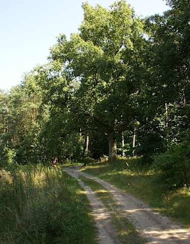 Unterwegs geht es an zwei einzelnen Gehöften vorbei. Zuerst kommt der Wilhelmshof auf der linken Seite. Wenige hundert Meter später folgt der Scharnhorst Hof. Hier gabelt sich der Weg. Nicht rechts dem Betonplattenweg folgen sondern geradeaus auf den kleinen Wiesenpfad wandern. Links kommt nach dem Hof ein kleiner Weiher, an diesem vorbeiwandern. Der Pfad führt zum Wald hinauf. Den Betonplattenweg, er knickt nach rechts ab, verlassen und gerade auf einem Feldweg weiterwandern. Wenn sich dieser gabelt rechts halten. Bald kommt ein Damwild-Gehege.