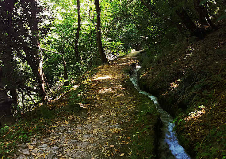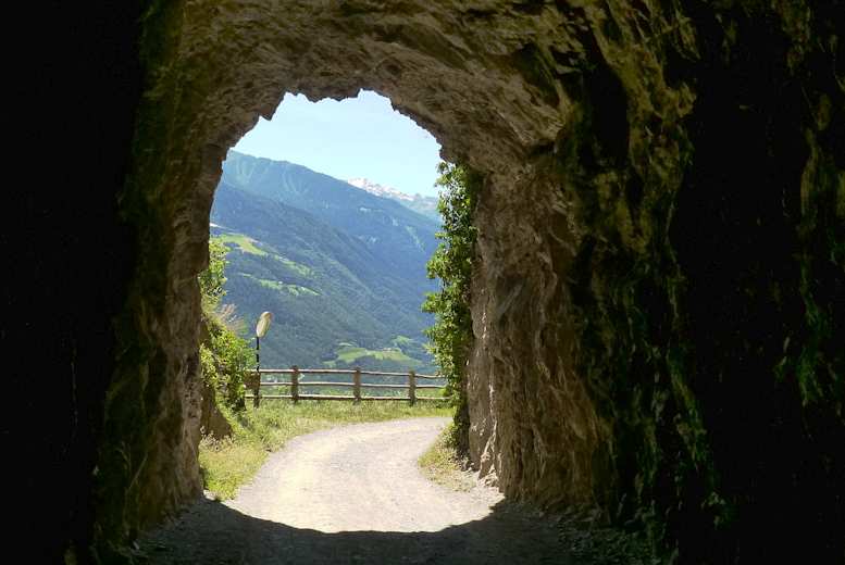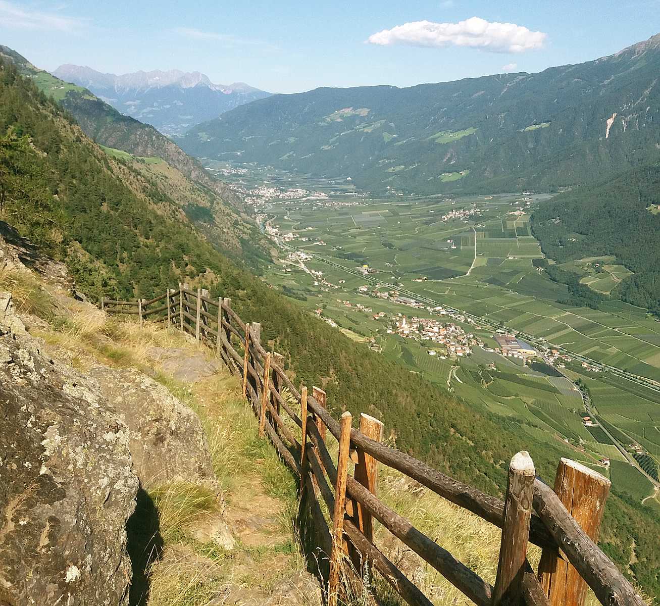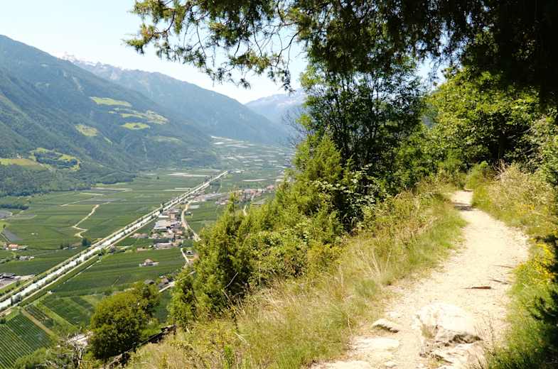 Von Reinhold Messners Schloss Juval am Sonnenberg oberhalb Staben führt die Route über Trumsberg bis nach St. Martin im Kofel. Es ist eine lange Etappe, bei der gar einige Höhenmetern bewältigt werden müssen. Im Sommer sollte man diesen, noch etwas tiefer gelegenen Abschnitt bereits in den frühen Morgenstunden in Angriff nehmen, denn die die intensive Sonneneinstrahlung am Vinschger Sonnenberg ist gnadenlos.