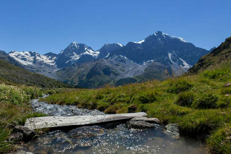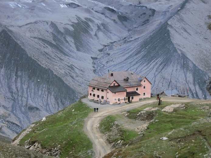 Von Sulden wandert man zum Langenstein (2.350 m) und über die Möränen des Ende-der-Welt-Ferners über den Morosiniweg zur Hintergrathütte (2.661 m) und weiter über den Gletscherweg zur Schaubachhütte (2.581 m).