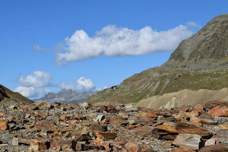 Ab hier folgt man dem gut beschilderten Weg nach Osten. Die Schautafel zeigt auf beeindruckende Weise auf, bis wohin der Langtauferer Ferner am Ende der Vorstoßperiode im Jahre 1830 gereicht hat. Eine überraschende und zugleich beängstigende Information über den unaufhaltsamen Rückgang dieses Gletschers, der sich inzwischen kilometerweit zurückgezogen hat.