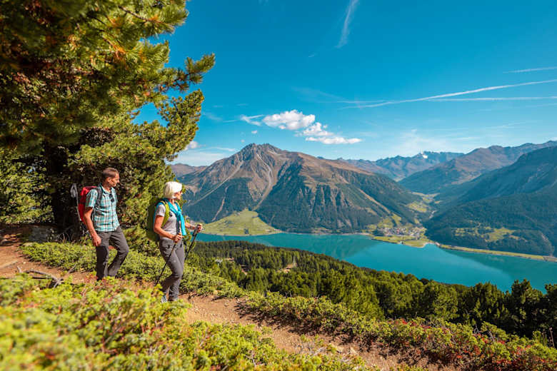 Ein leichter, aussichtsreiche Höhenweg an den östlichen Ausläufern der Sesvennagruppe mit prächtigen Ausblicken ins Ortlermassiv und auf den blau-grünen Reschen- und Haidersee.