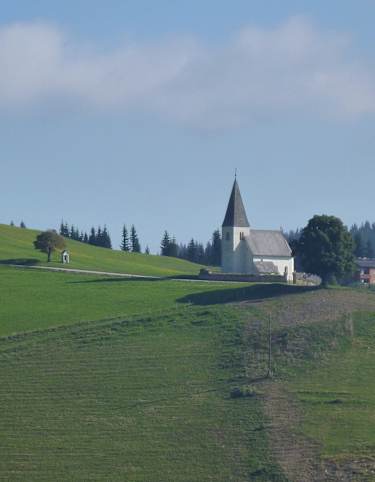Es geht weiter bergauf und wieder in den Wald hinein und auf einer Forststraße zum Kömmelgupf mit der alten Schule (privat). Durch den Wald wandert man weiter zu einem Gehöft, von wo man einen grandiosen Blick auf das Jauntal erhält. Den nächsten schönen Blick erhält man vom Gehöft Tratter, bevor man das Anwesen Pongratnig mit der nahe gelegenen Kirche Heiligenstadt erreicht.