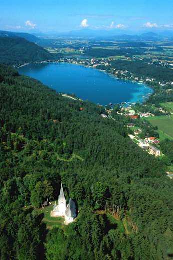 Von oben überblickt man Völkermarkt und den tief blau schimmernden Klopeiner See.